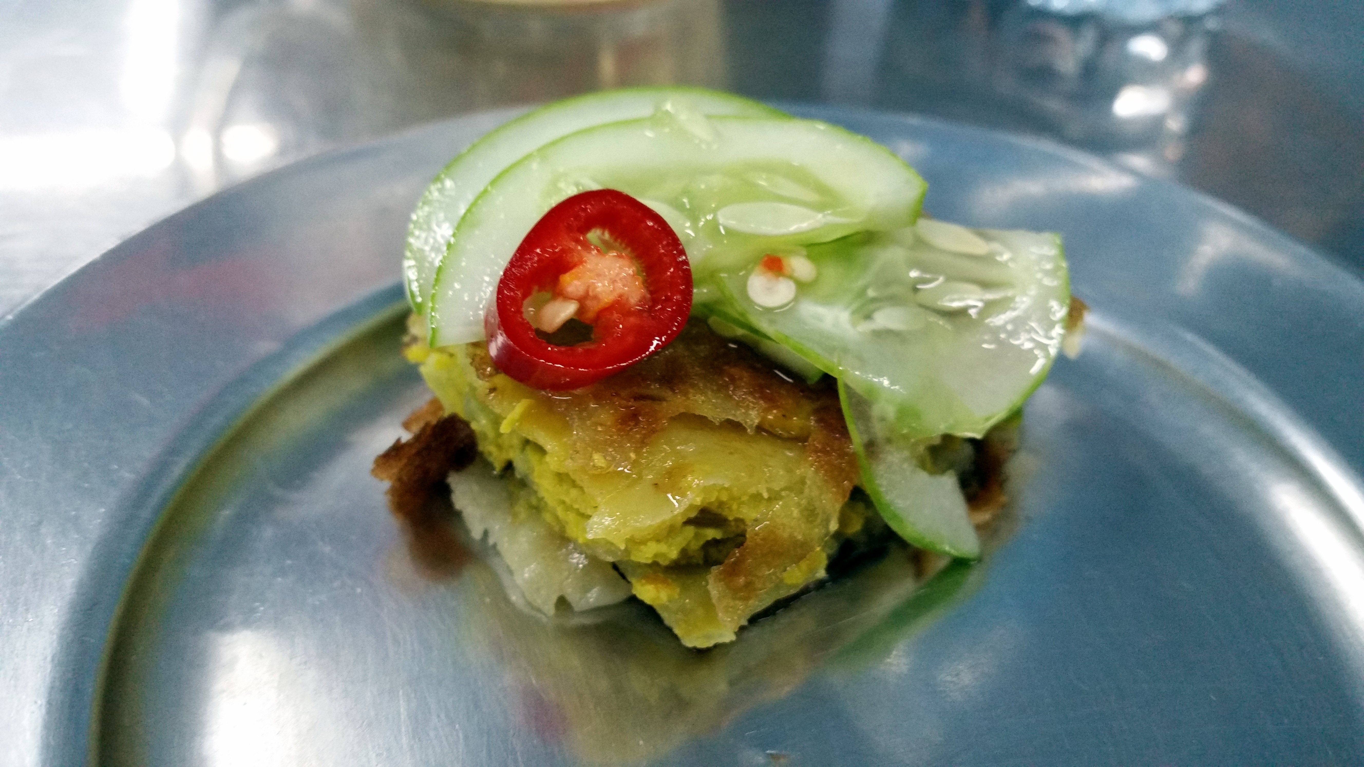 After the duck, we went to see a Buddhist temple though I can’t remember what made it special enough for a detour. It was a nice temple I suppose, and it was interesting to hear about the juxtaposition of Buddhism and Hinduism (the temple had an icon of Vishnu at its entrance). But I was in a food type of mood, and soon we were at a restaurant whose sign said it served Muslim fare, which I found curious. I’d never thought of Muslim as a food category. We had a pastry filled with curried chicken, and served with cucumber and vinegar. I didn’t take a picture of the next dish but it was amazing: curry noodles. The meat in it was not very good but the broth was intensely flavorful.