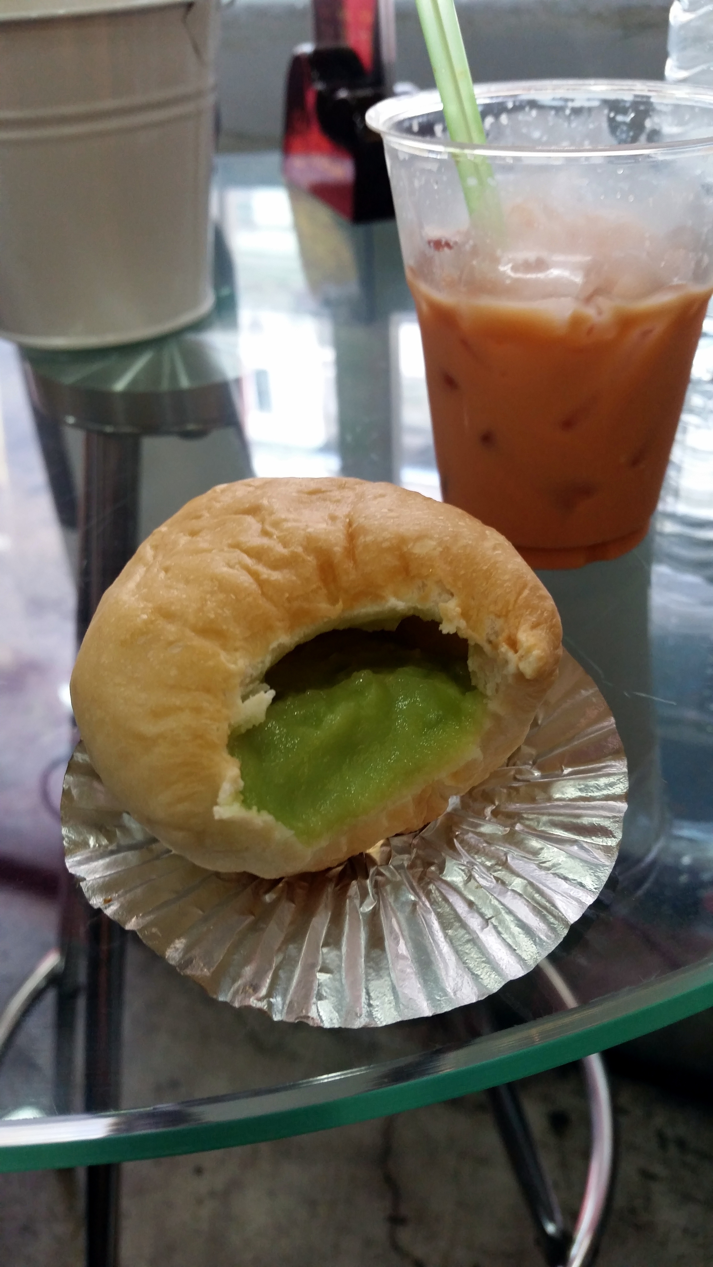 Our next visit was to a cafe that seemed like a generic yuppie metropolitan coffeehouse but offered a green custard filled bun (devoured in moments) and Thai iced tea (finished even quicker). The Thai iced tea, called milk tea in Thailand, tastes pretty much the same as in the US but this one was just a bit creamier and, unsurprisingly, just a bit more intense in its flavor.