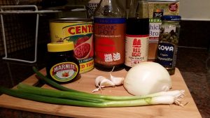 I slice and dice some onions very thinly and saute them in a substantial amount of olive oil. I’m looking for them to eventually dissipate into the sauce. Add some garlic after a bit, throw in a pinch of cumin and pul biber, let that get fragrant then dump in the tomatoes. Stir in some umami bombs – a great and easy idea I read in a cookbook: a few shakes of soy sauce, a couple drips of fish sauce (or anchovies would be great) and a teaspoonish of marmite.