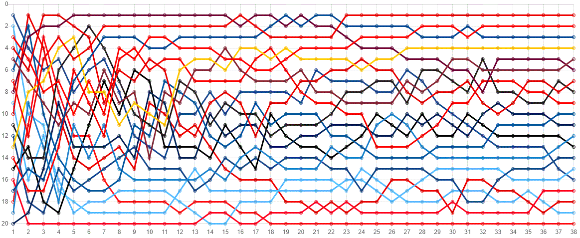But the chart also lends weight to the idea that the dramatic finish didn’t necessarily reflect a drama-filled season. You can see most of the places flatten out into a bit of a mundane stability in the final weeks and it’s the absolute bonkers end to the season (as a reminder, City were down eight points after Week 32) that will live long in the memory.
