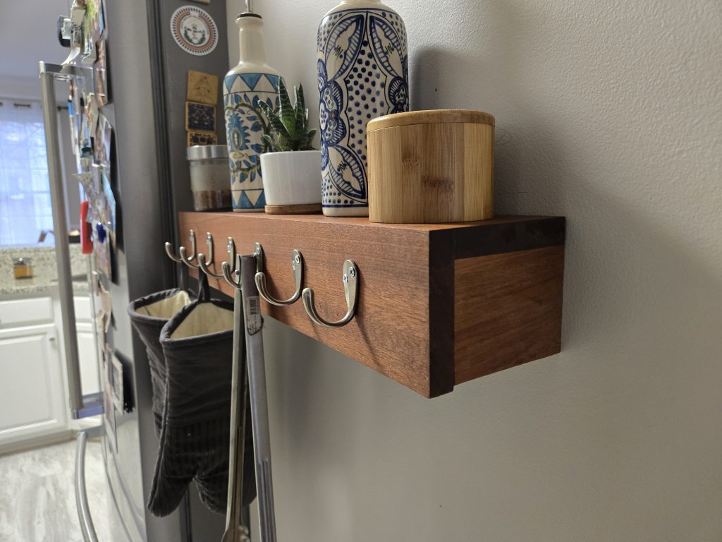 The floating shelf, which sits on a cleat, is tremendously useful and elegant in its shimmering mahogany.