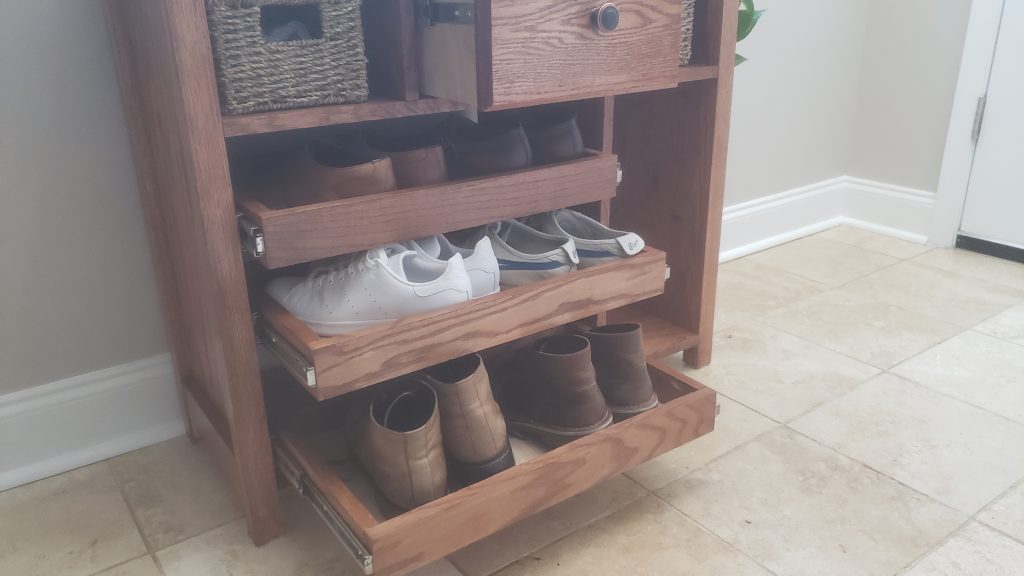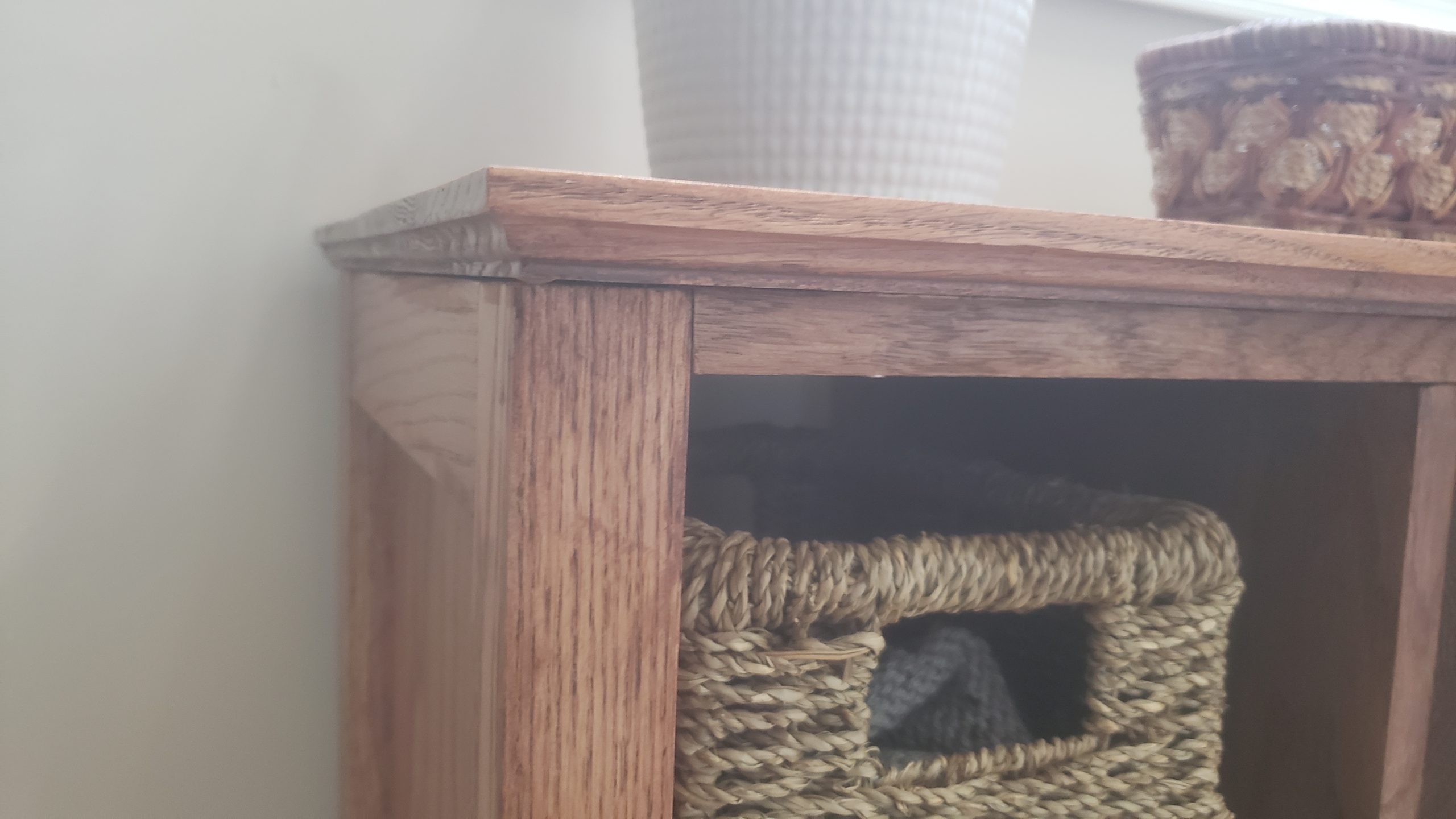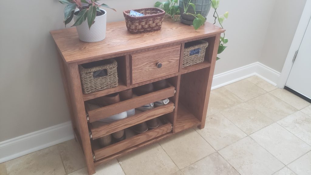 I’m generally pleased with the design and execution of this console. It was my first piece routing an edge profile, choosing the Roman ogee, mostly because of its name. The top and drawer front are solid oak with the rest of the construction made of of oak-veneered plywood.