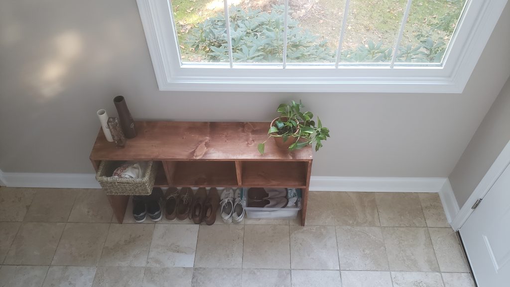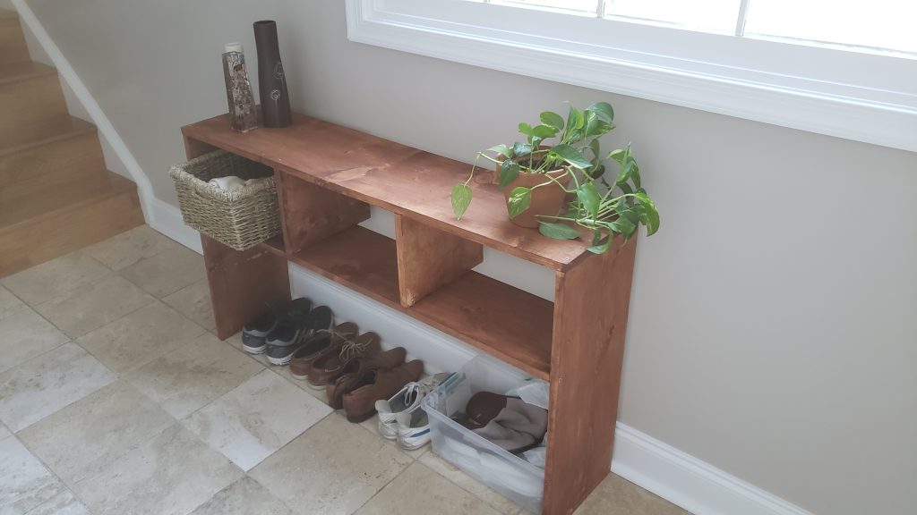 Yikes! For this piece, my first attempt at furniture, I had only a circular saw at my disposal. Made of the cheapest wood from the big box store; put together with glue, screws (into end grain no less), and nail; hopelessly skewed and awfully stained: and yet I proudly displayed this for years in my entryway, the first sight that visitors laid their eyes upon.