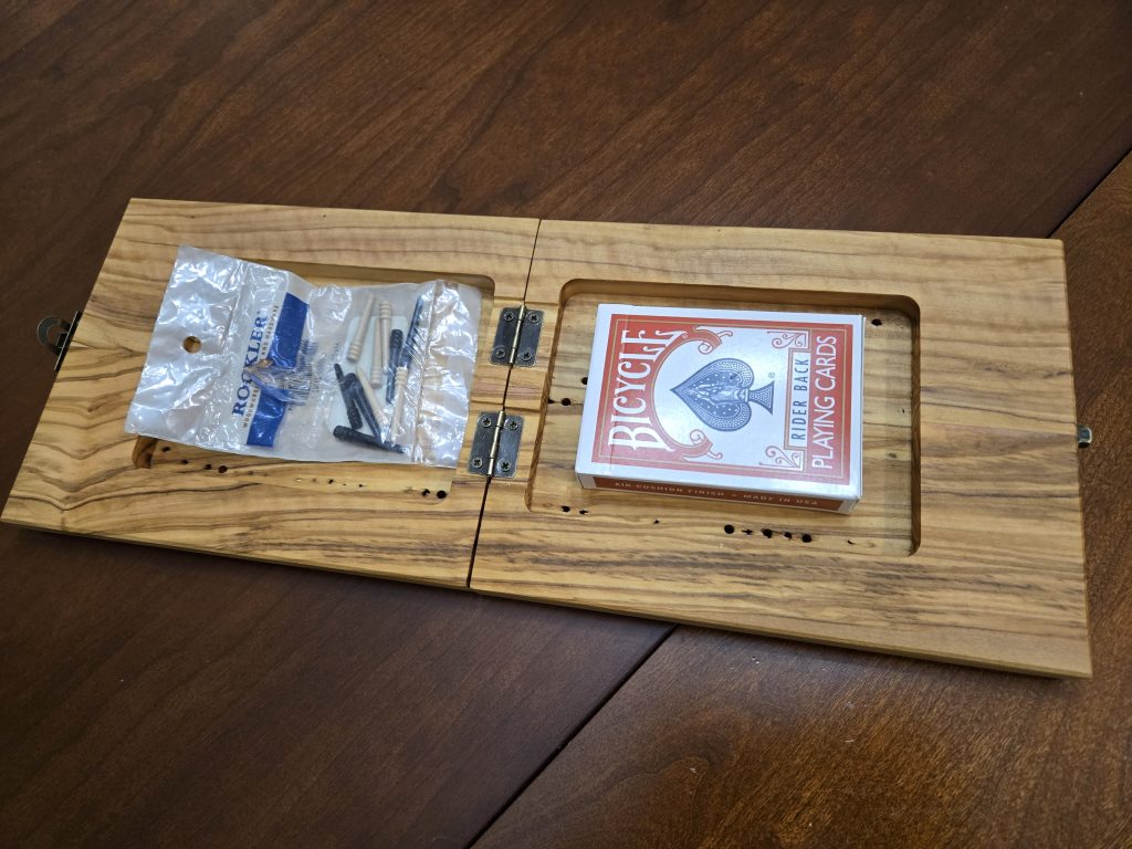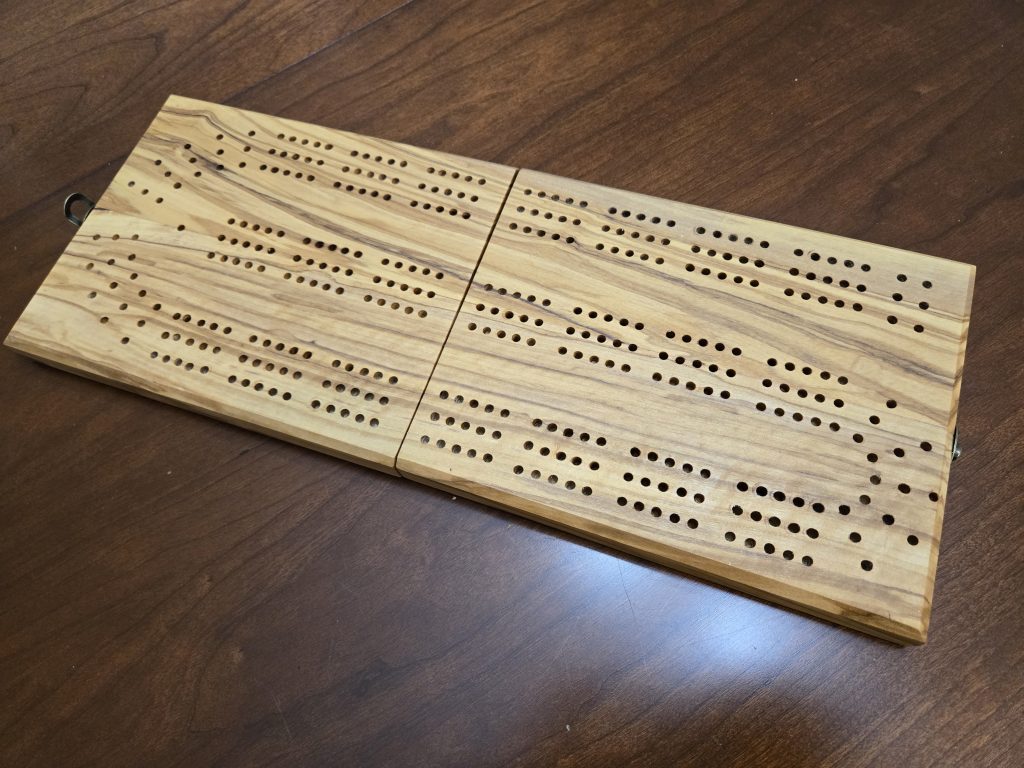 I built this travel cribbage board as a gift and it falls in the category of almost perfect. I absolutely love the figuring of the olive wood and pictures struggle to do the richness of its color justice. Unfortunately, while drilling dozens of holes, a few popped through the surface though thankfully they are visible only on the inside. Just another small sign of character. Except for the interminable drilling, this piece was plenty of fun to make and I love how it turned out.